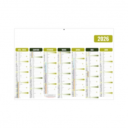 Calendrier bancaire Format : (55 x 34.5 cm) BASECO VERT Minimum de commande : 500 exemplaires 1.52 € (HT) Bandeau 100% personnalisable. Ajoutez vos logos, images et textes.