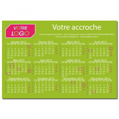 Calendrier Magnet (Aimanté) Format : A5 (15 x 21cm), A4 (21 x 30cm) Une page Recto Verts imbriqués Minimum de commande : 50 exemplaires 2.6 € (HT) 100% personnalisable. Emplacement libre de vos photos, sponsors et textes.