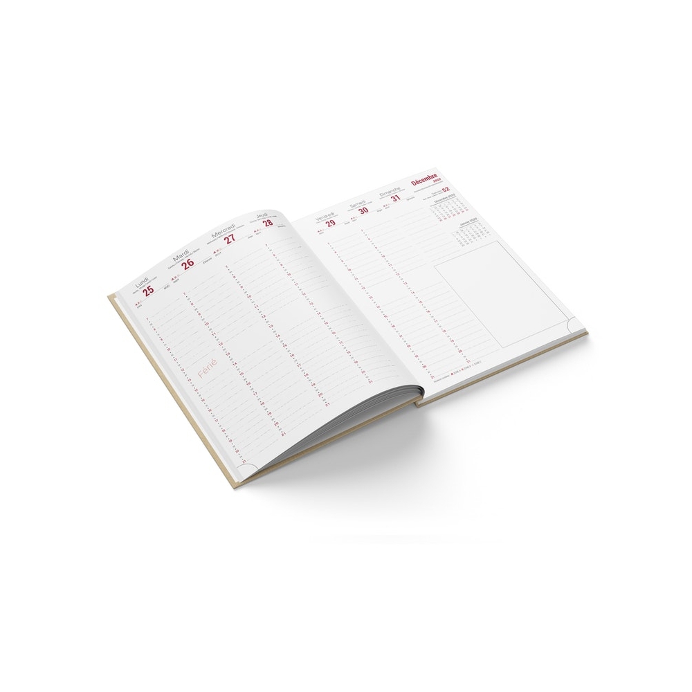 Pages intérieures : 144 pages, papier 90 g/m2, grille internationale (5 langues : Français, Anglais, Allemand, Italien, Espagnol) avec les n° de semaines et les Saints. L'agenda semainier débute à la mi novembre et fini à la mi janvier. Imprimée en deux couleurs gris et rouge.