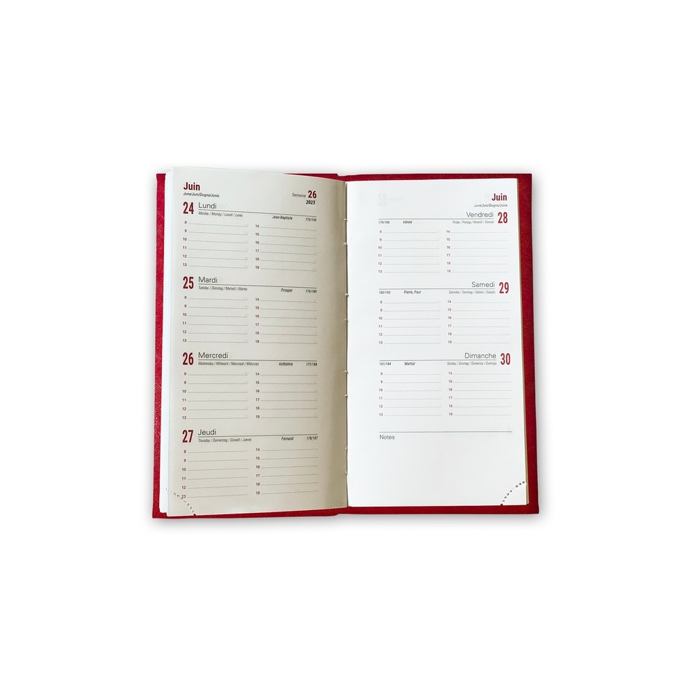 Pages intérieures : 128 pages, papier 70 g/m2, grille internationale (3 langues : Français, Anglais, Allemand) avec les n° de semaines et les Saints. L'agenda semainier débute à la mi décembre et fini à la mi janvier. Imprimée en deux couleurs gris et rouge..