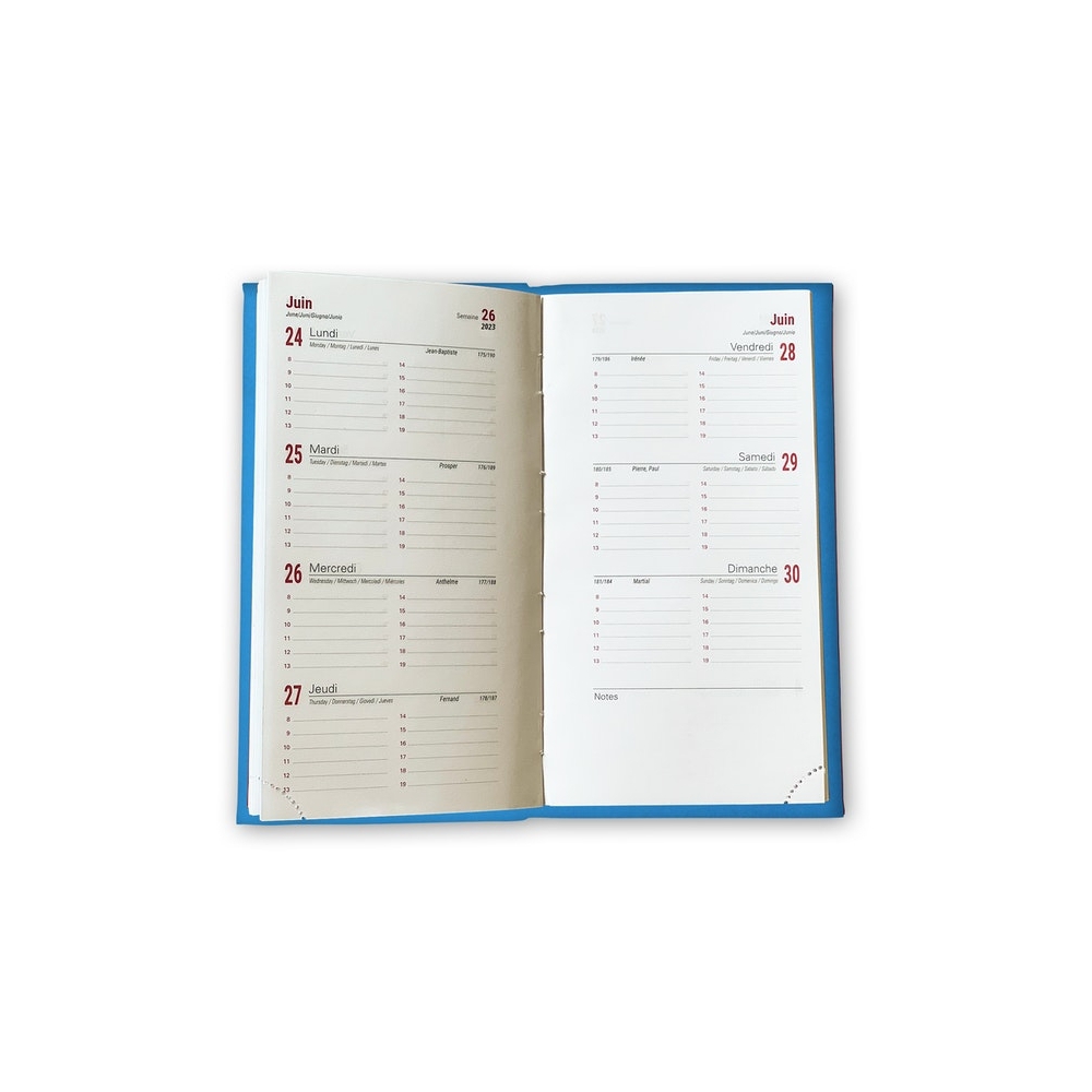 Pages intérieures : 128 pages, papier 70 g/m2, grille internationale (3 langues : Français, Anglais, Allemand) avec les numéros de semaines et les Saints. L'agenda semainier débute à la mi décembre et fini à la mi janvier. Imprimée en deux couleurs gris et rouge.