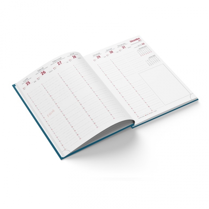Pages intérieures : 128 pages reliées par une spirale blanche, une semaine par page, papier 70 g/m2 blanc, grille internationale (5 langues : Français, Anglais, Allemand, Italien, Espagnol) en 2 couleurs, avec les n° de semaines et les Saints. L'agenda semainier débute à la mi décembre et fini à la fin décembre. Imprimée en gris uniquement en haute qualité.
