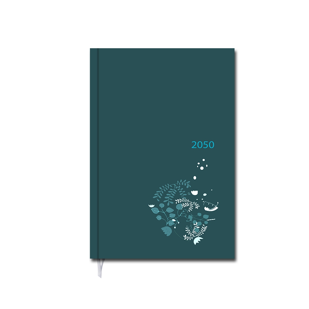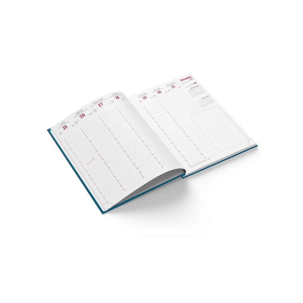 Pages intérieures : 128 pages reliées par une spirale blanche, une semaine par page, papier 80 g/m2 blanc, grille internationale (5 langues : Français, Anglais, Allemand, Italien, Espagnol) en 2 couleurs, avec les n° de semaines et les Saints. L'agenda semainier débute à la mi décembre et fini à la fin décembre. Imprimée en gris uniquement en haute qualité.