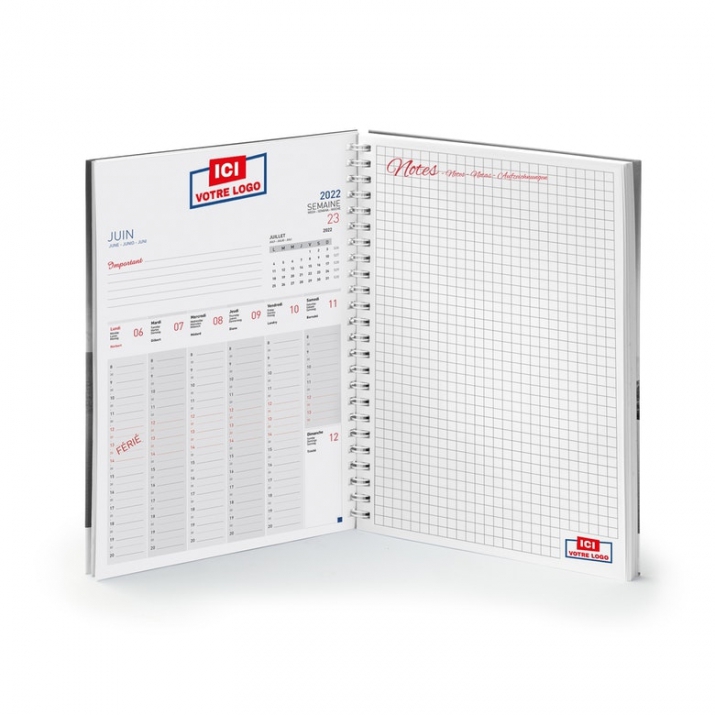 Pages intérieures : 126 pages reliées par une spirale blanche ou noire, papier 90 g/m2 blanc. Semainier avec une grille internationale en deux couleurs (au choix et à préciser après votre commande) - un atlas et treize pages planning et notes. Toutes les pages intérieures sont à personnaliser avec vos logos et textes de votre choix dans notre interface de création en ligne. Personnalisation identique sur toutes les pages.