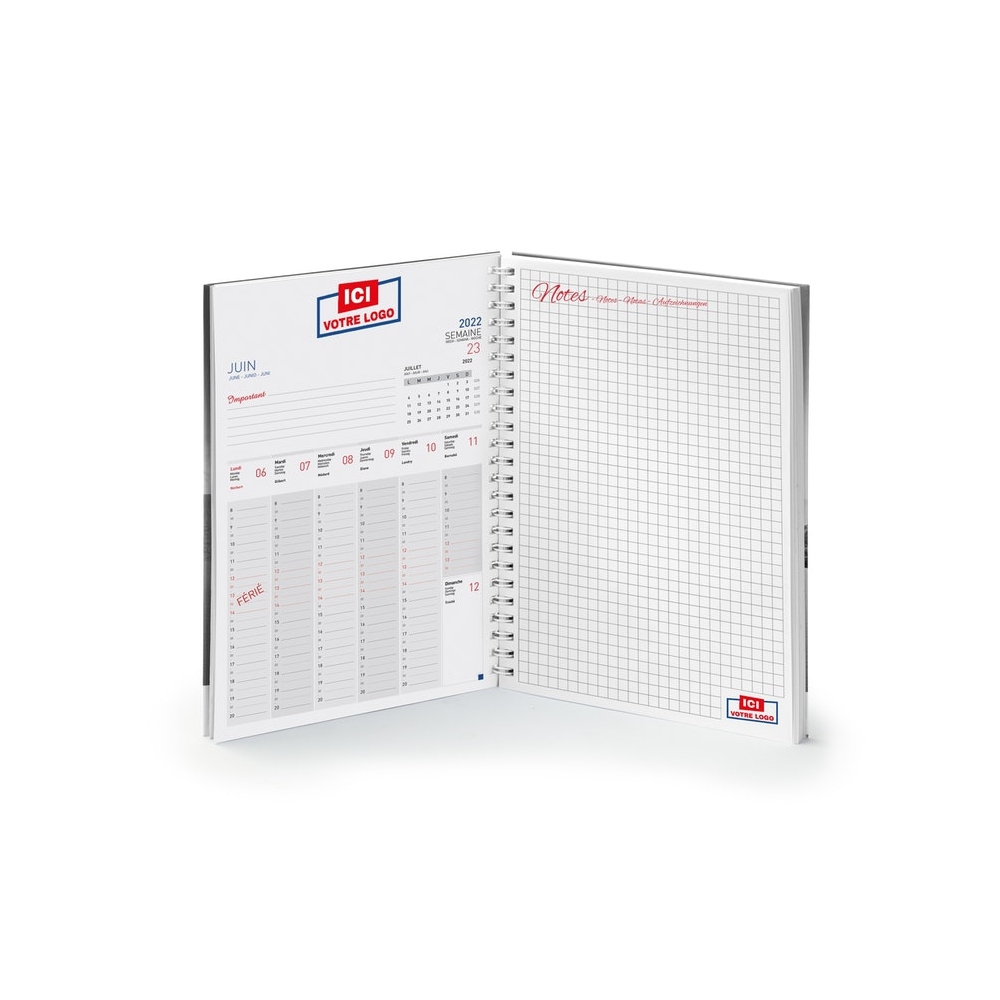 Pages intérieures : 126 pages reliées par une spirale blanche ou noire, papier 90 g/m2 blanc. Semainier avec une grille internationale en deux couleurs (au choix et à préciser après votre commande) - un atlas et treize pages planning et notes. Toutes les pages intérieures sont à personnaliser avec vos logos et textes de votre choix dans notre interface de création en ligne. Personnalisation identique sur toutes les pages.