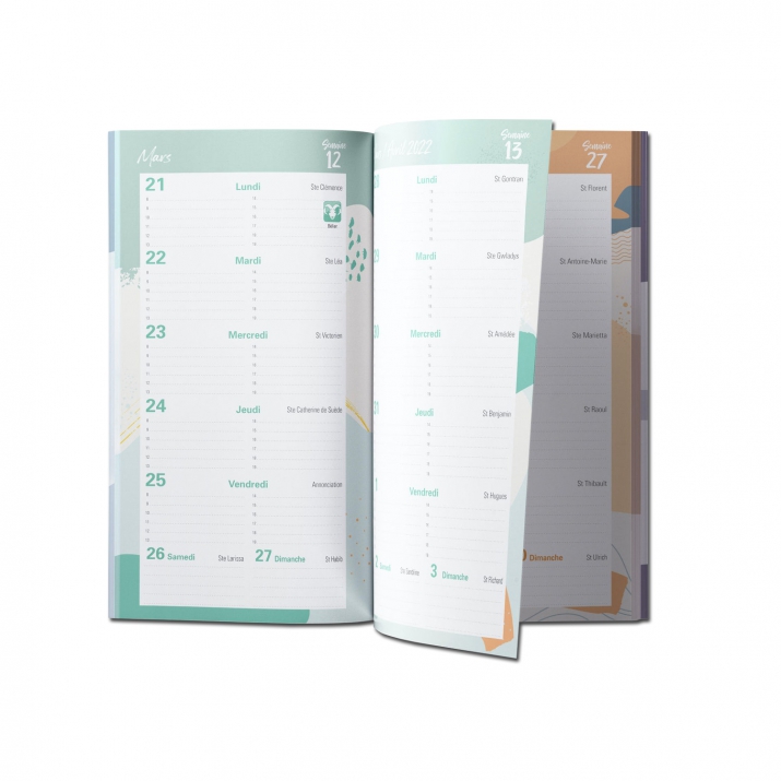 Pages intérieures : 64 pages agrafées, papier 70 g/m2, grille en Français avec les n° de semaines et les Saints. Votre agenda semainier de poche débute fin décembre et fini début janvier. Impression en quadri. haute qualité.