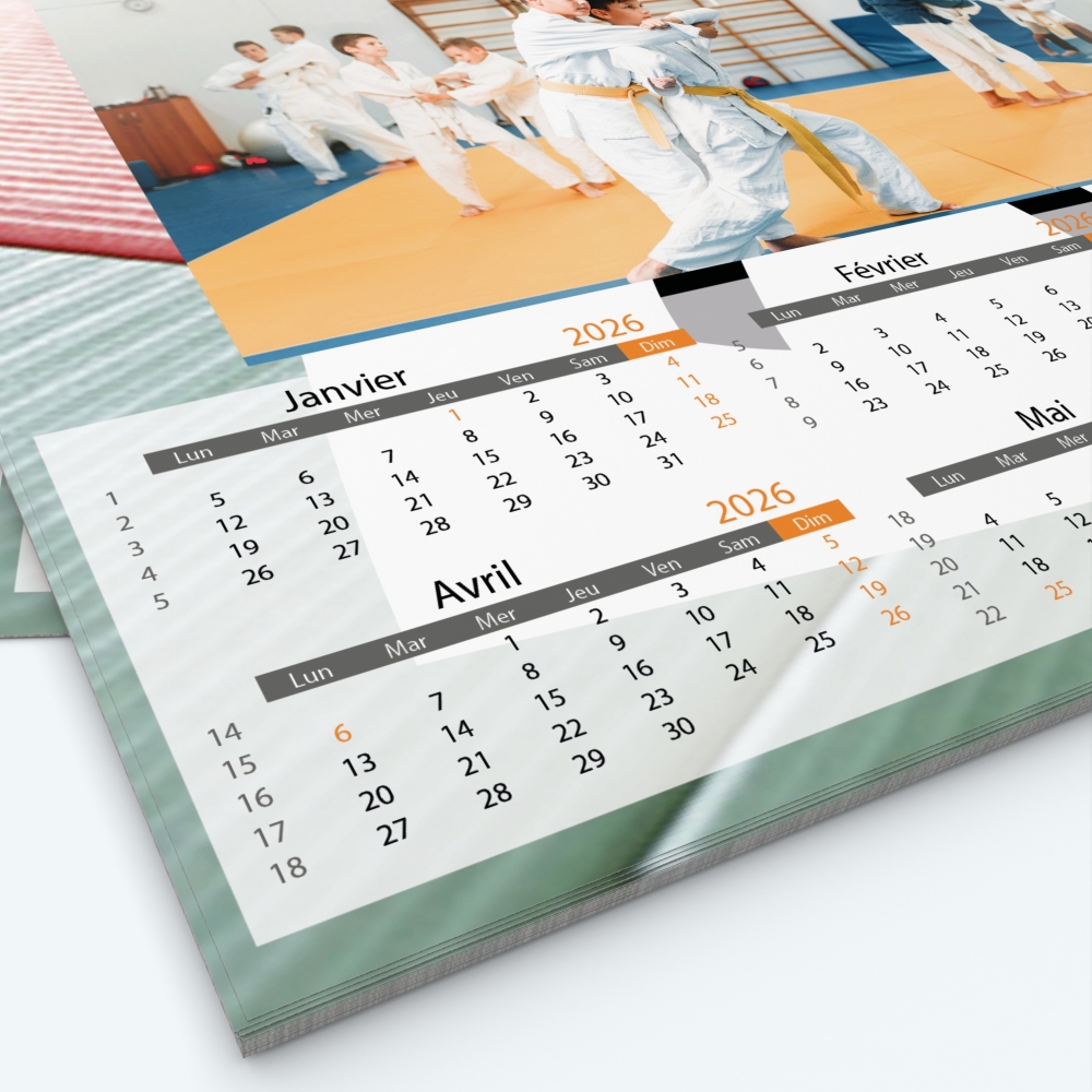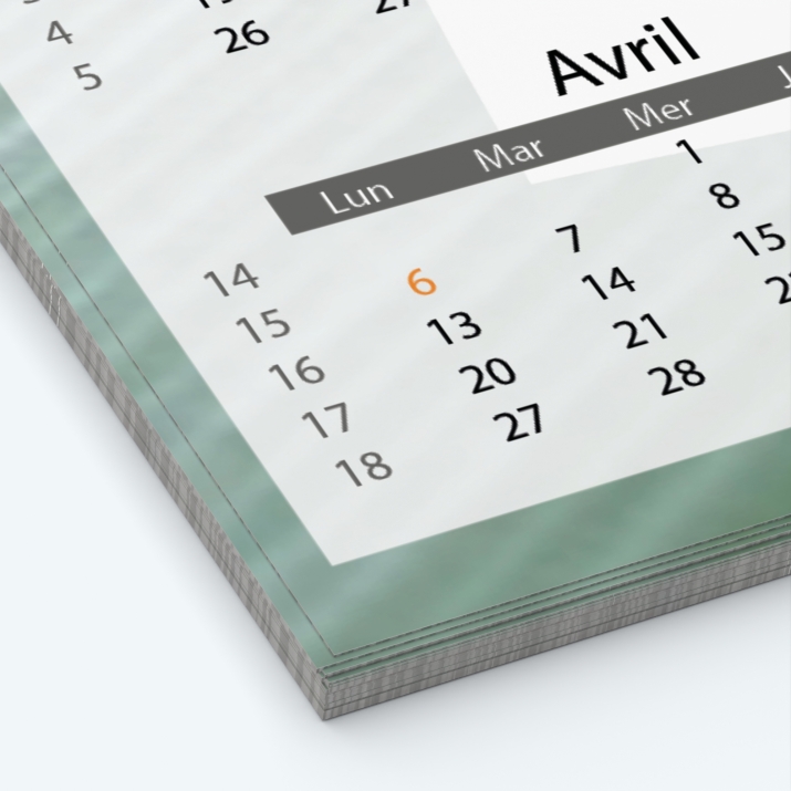 Grille : 6 mois recto/6 mois verso (choix du mois de départ, couleurs de la grille au choix, possibilité d'ajouter vos propres événements).