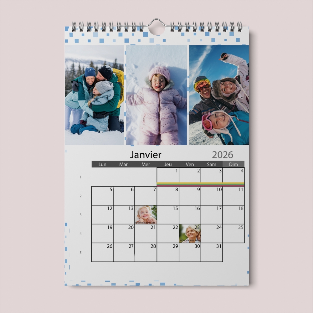 Composé de 13 feuillets, ce calendrier vous permet de marquer vos dates anniversaires avec vos propres photos et commentaires. Disposez aussi vos images en partie haute pour accompagner chaque mois d’un souvenir unique.