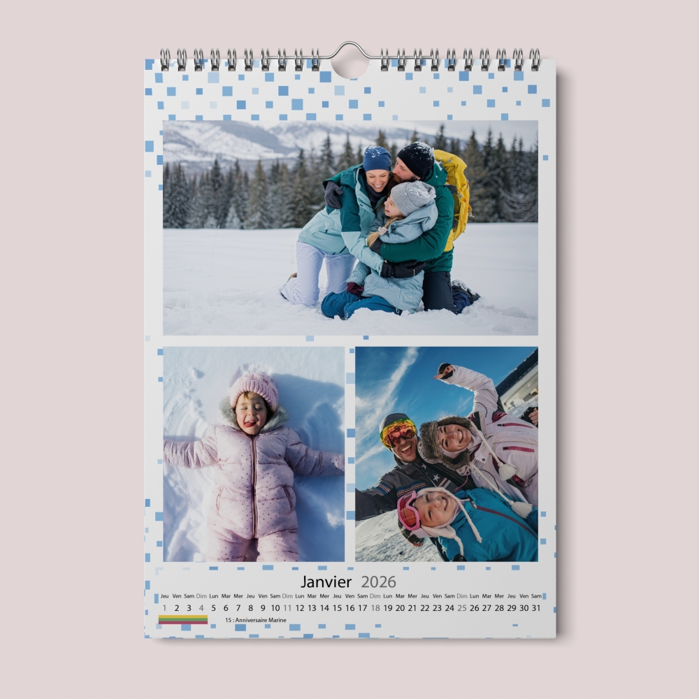 Grâce à notre interface de création en ligne directement accessible depuis le bouton "Je crée" (situé en haut de cette page), vous créez rapidement et simplement votre Calendrier photo. Dans le studio de création, vous téléchargez vos photos, vous placez vos textes et personnalisez selon vos goûts la grille de votre Calendrier. Parmi les nombreuses possibilités qu'offre le studio de création, vous pouvez également ajouter des événements sur la grille calendaire. En résumé, votre Calendrier photo est totalement personnalisable , rien n'est figé : tout est modifiable !