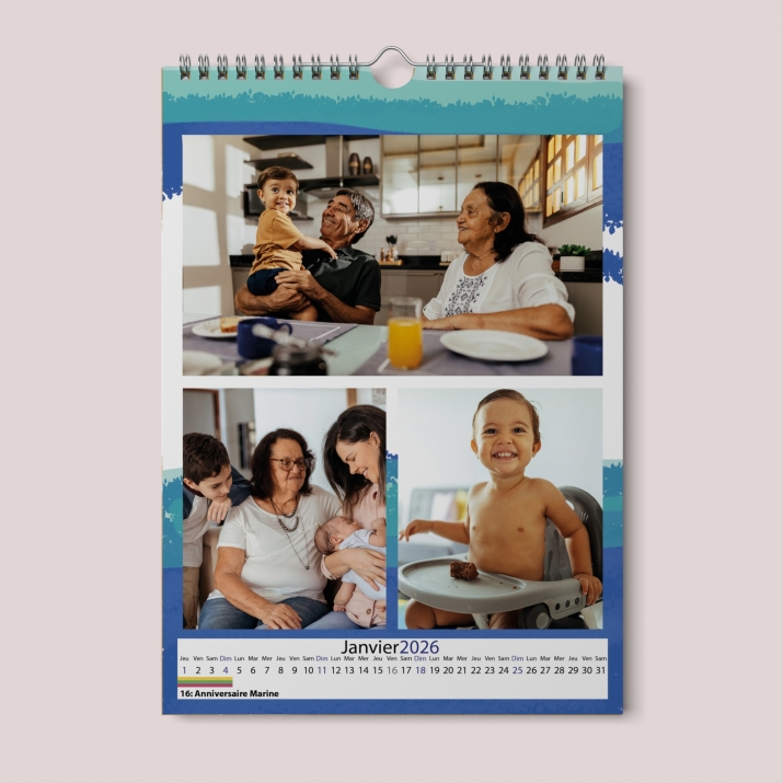 Ce calendrier met vos photos à l’honneur en grand format sur la partie haute. Composé de treize feuillets, il sublime vos images mois après mois et se transforme en véritable objet de décoration murale.